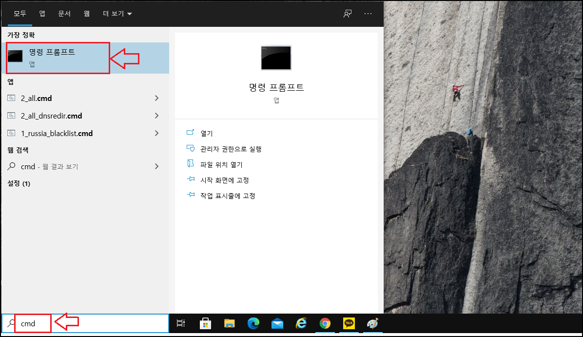 우선 PC 검색창에서 [cmd]를 검색하셔서 명령 프로프트 를 실행해주세요.