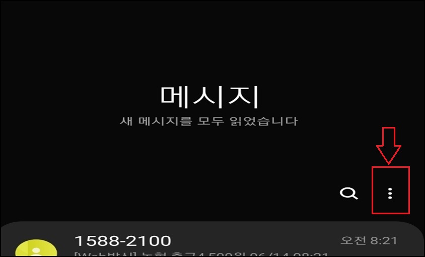 메세지 어플을 실행 후 오른쪽 중간 부분에 [메뉴]를 클릭해주세요.