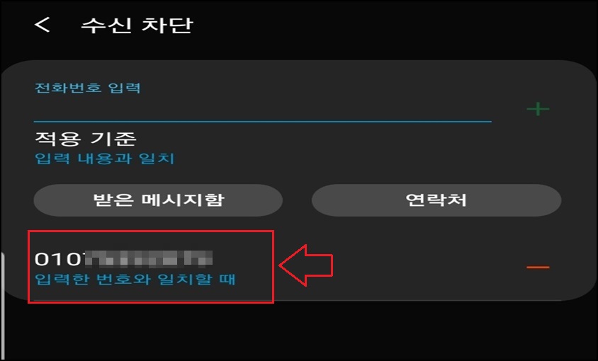 위 사진과 같이 입력한 번호와 일치할 때 차단되는 갤럭시의 스팸차단 기능이에요. 정말 간단하죠?