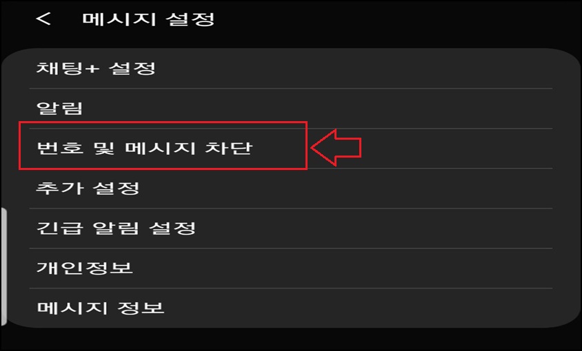 메시지 설정에서 [번호 및 메시지 차단] 메뉴를 클릭해주세요.