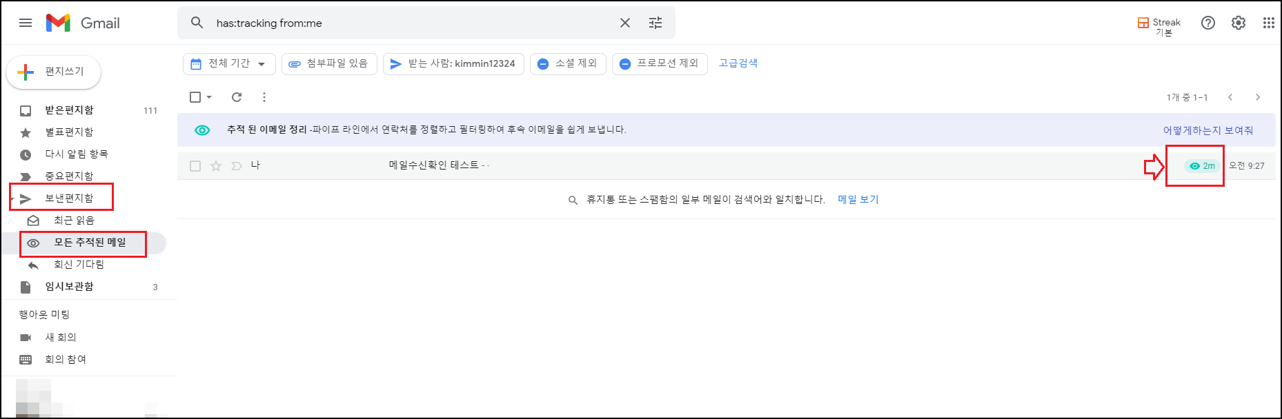 네이버 메일에서 읽은 뒤 다시 구글 메일에서 [보낸 편지함] -> [모든 추적된 메일]메뉴로 가시면 메일수신확인테스트 부분에 초록색 표시로 변경됨을 확인할 수 있어요. 해당 상태는 상대방이 메일을 수신한 상태라고 보시면 되요. 정말 간단히 구글메일에서 수신확인할수가 있죠?