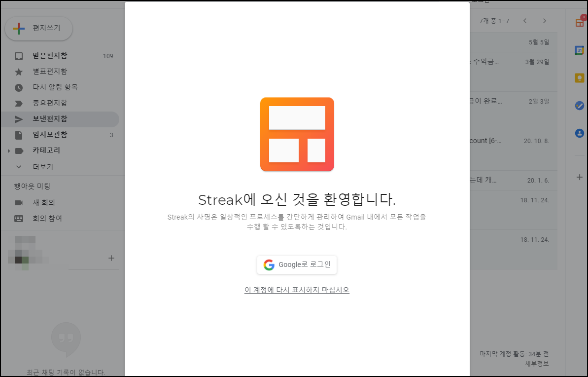 다시 여러분의 구글 메일로 접속을 하시면 위 사진과 같이 "Streak에 오신 것을 환영합니다."라는 메시지를 확인할 수 있는데, [ Google로 로그인] 버튼을 클릭해주세요.