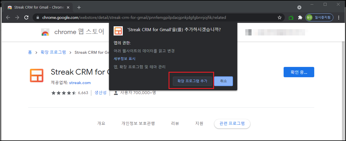[ 확장 프로그램 추가]를 클릭해주세요.