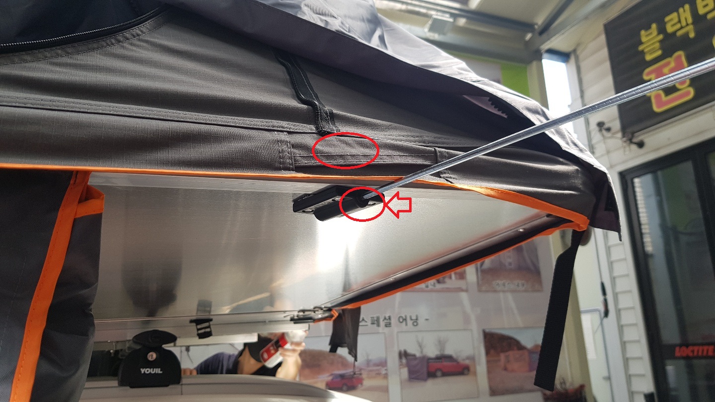 제가 설치한 제품은 신형 제품으로 기존에는 위에 동그라미에 창문을 열 철사를 꼽을 공간이 있었는데, 이번 개선된 사항으로 텐트 아래쪽에 창문 고정 철사를 연결할 수 있도록 변경되었다고 해요. 유튜브에서 많이 보신 분들은 한눈에 아실 수 있을 것 같아요^^.