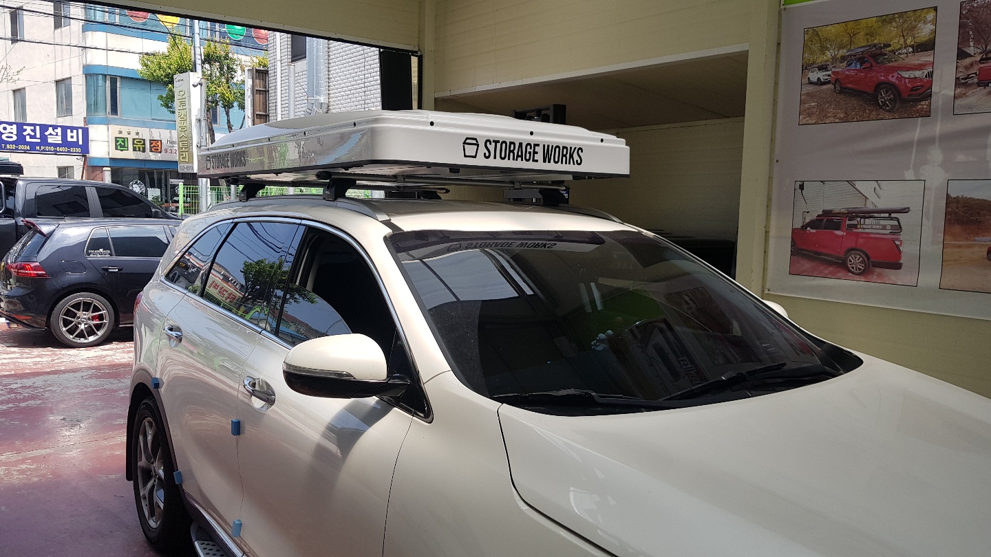 주차장이 생각보다 넓은 편은 아니지만 예약제이기에 시간대에 맞춰서 가신다면 주차는 어렵지 않게 하실 수 있어요. 사장님 차에 달린 루프 박스도 역시 스토리지웍스 제품이죠^^. 검은색 스토리지웍스 루프탑텐트는 많이 보셨을 텐데, 흰색 제품은 많이 못 보셨을 것 같아요.