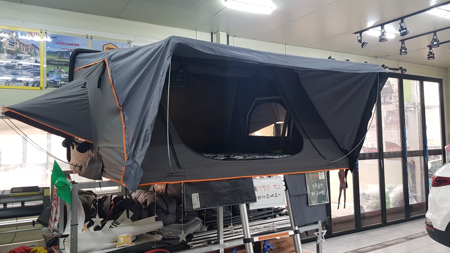 사무실 내부에는 루프탑텐트를 누구나 볼 수 있게 전시해놓으셨어요. 내부 모습은 추후 포스팅해보겠지만 성인 남성 4명은 충분히 지낼 수 있는 공간이에요. 트렁크에서 누웠을때하곤 확실이 차이가 나는 편안함과 안락함!!! 이번 주 캠핑이 기대되는 순간이네요^^.