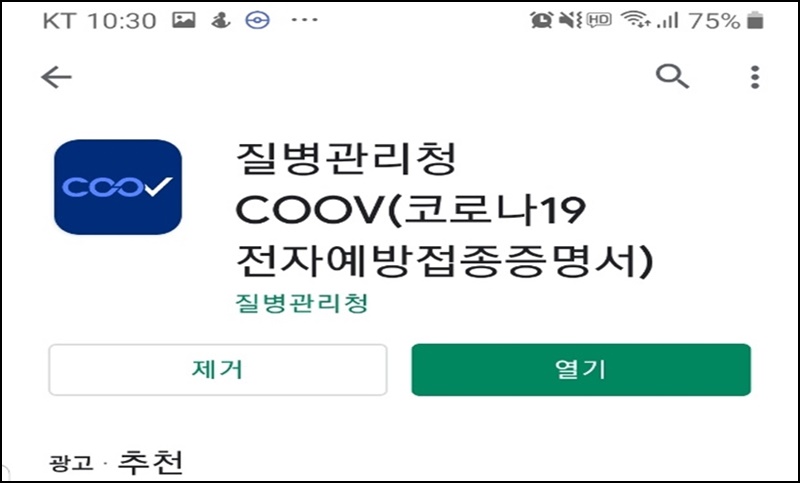 모바일에서 코로나19 예방접종 증명서를 발급받는 방법은 구글 스토어에서 "질병관리청 COOV"어플을 검색하셔서 설치를 진행해주세요.