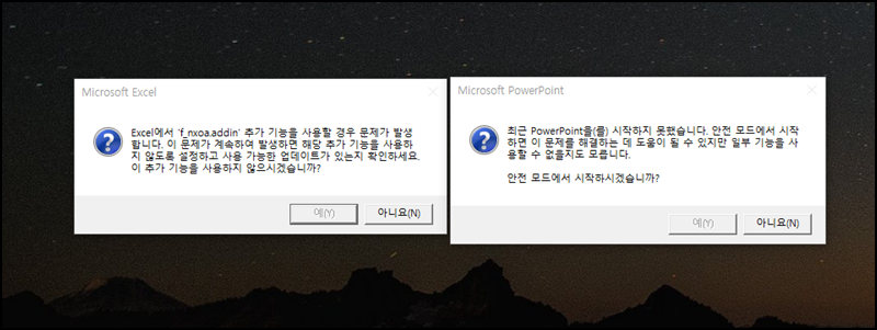 또 다른 메세지로는 Excel에서 'f_mxoa.addin'추가 기능을 사용할 경우 문제가 발생합니다. 이 문제가 계속하여 발생하면 해당 추가 기능을 하용하지 않도록 설정하고 사용 가능한 업데이트가 있는지 확인하세요. 이 추가 기능을 사용하지 않으시겠습니까?라는 메시지도 확인되네요. 또 다른 office 프로그램인 파워포인트를 실행해도 마찬가지예요. 몇 번이나 office 프로그램을 지웠었는데....