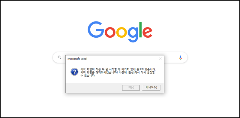 우선 엑셀을 실행해 위 사진과 같이 "시작 화면이 최근 두 번 시작할 때 예기치 않게 종료되었습니다. 시작 화면을 해제하시겠습니까? 나중에 [옵션]에서 다시 설정할수 있습니다"라는 메시지와 함께 엑셀이 실행되지 않아요. 이런 메시지 때문에 고생하셨던 분들은 제 블로그를 잘 찾아오셨어요^^.