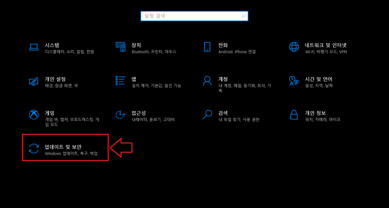 메뉴에서 [업데이트 및 보안]을 선택해서 들어가 주세요.