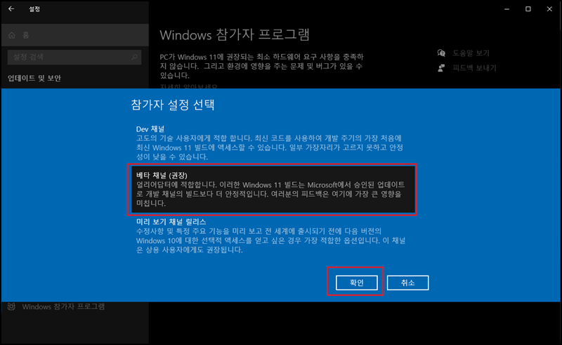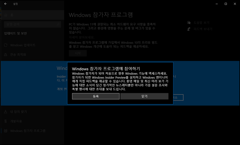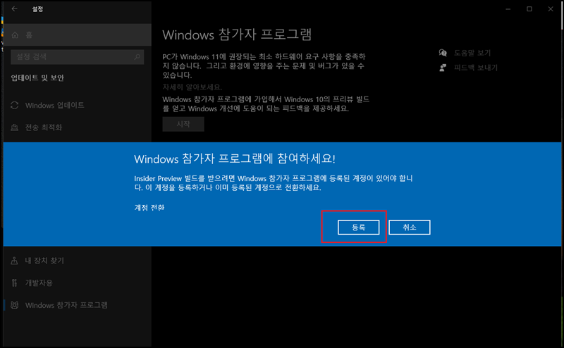 [Windows 참가자 프로그램에 참여하기] 등록 클릭!!!