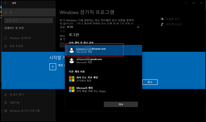 로그인할 본인의 마이크로소프트 계정을 선택 후 [계속]을 클릭해주세요.