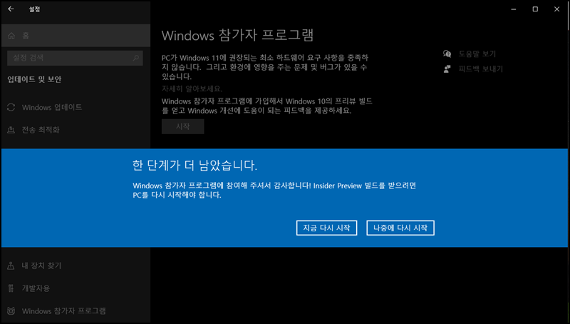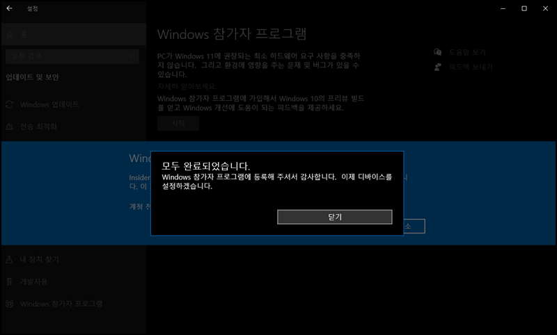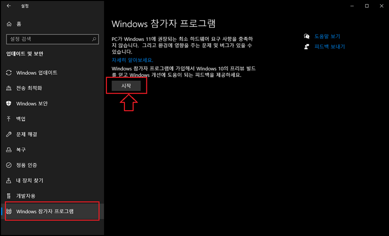 왼쪽 하위 메뉴에서 [Windows 참가 프로그램]을 선택 후 [시작] 버튼을 클릭해주세요.