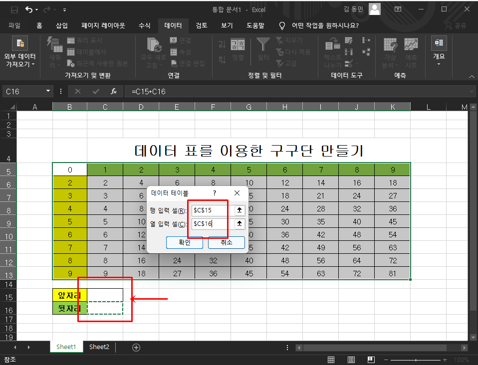 데이터 테이블 창이 나오면 [행 입력 셀]=C15, [열 입력 셀]=C16을 선택하신 뒤 [확인] 버튼을 클릭해주세요.