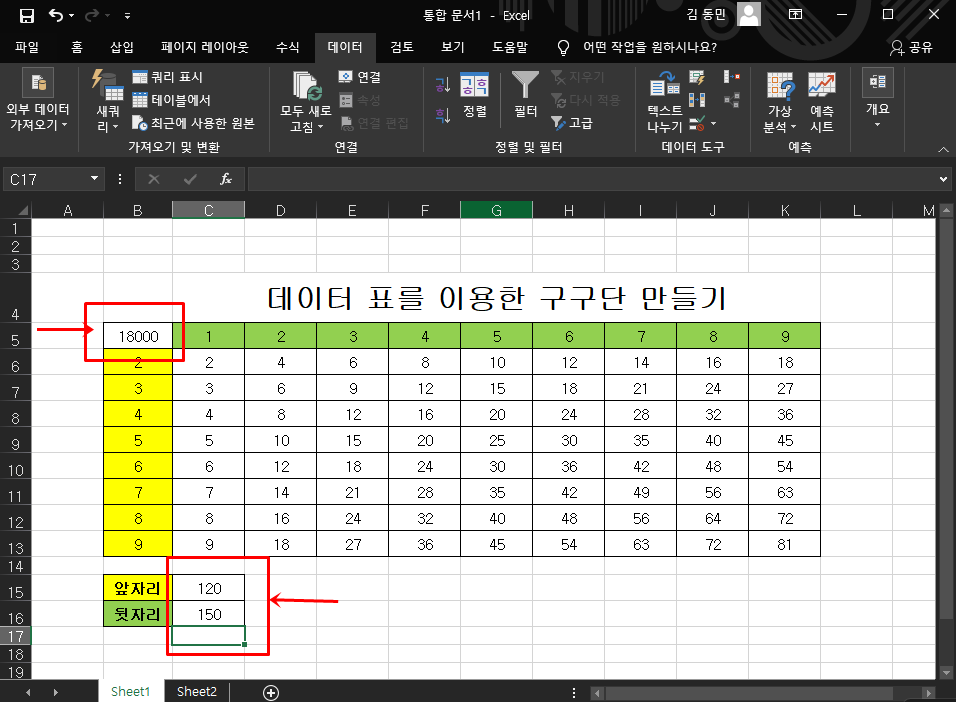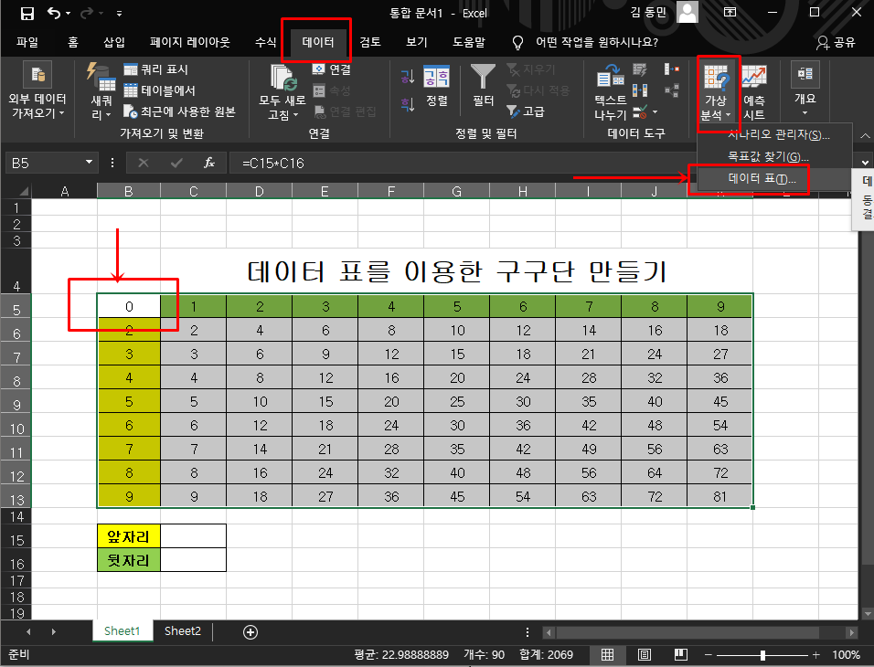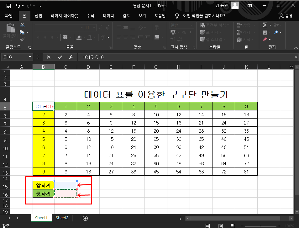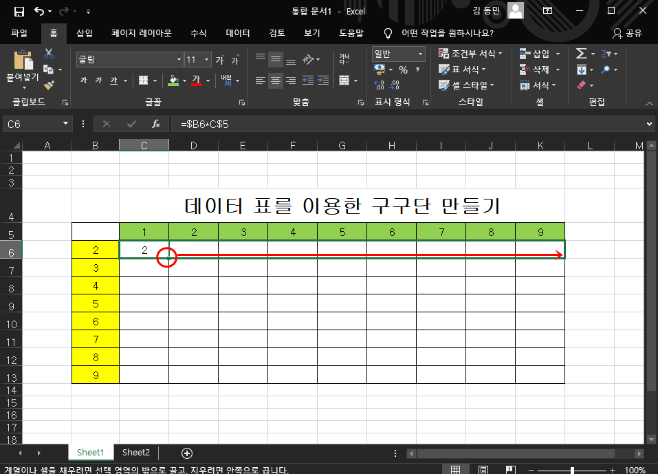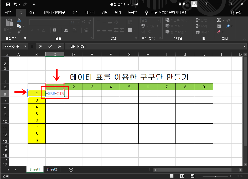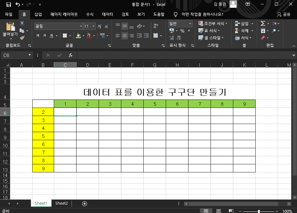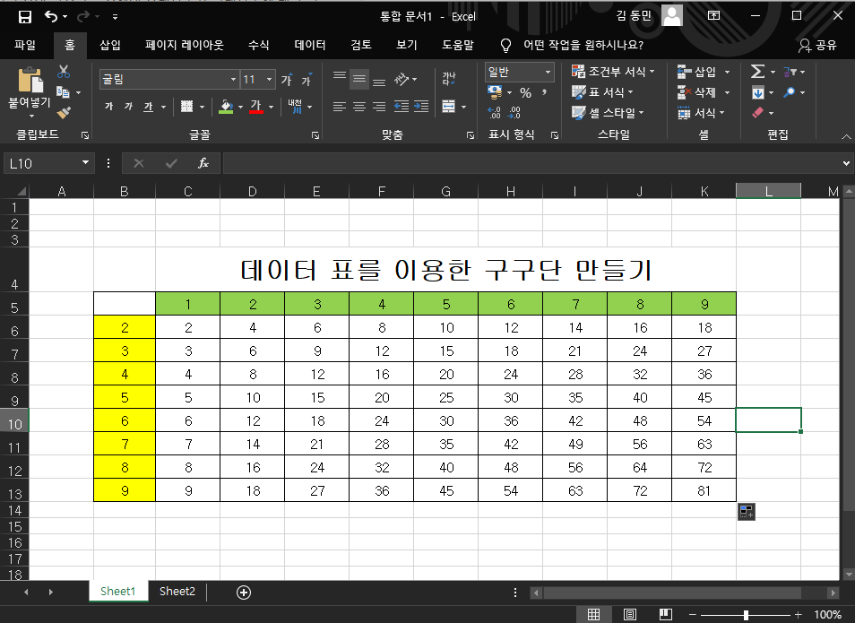구구단 표는 만들어졌으니 데이터 표 기능을 통해 구구단 표 수식을 만들어볼까요?