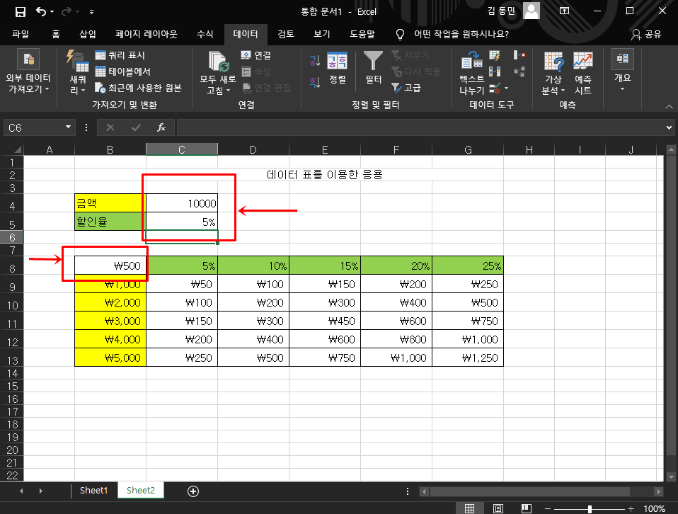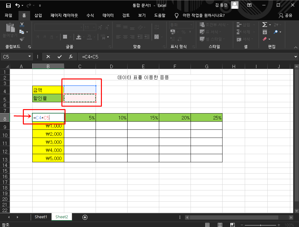 C4셀 금액과, C5셀 할인율을 입력하게 되면 B8셀에 할인금액의 데이터가 생성되는 것을 확인할 수 있어요.