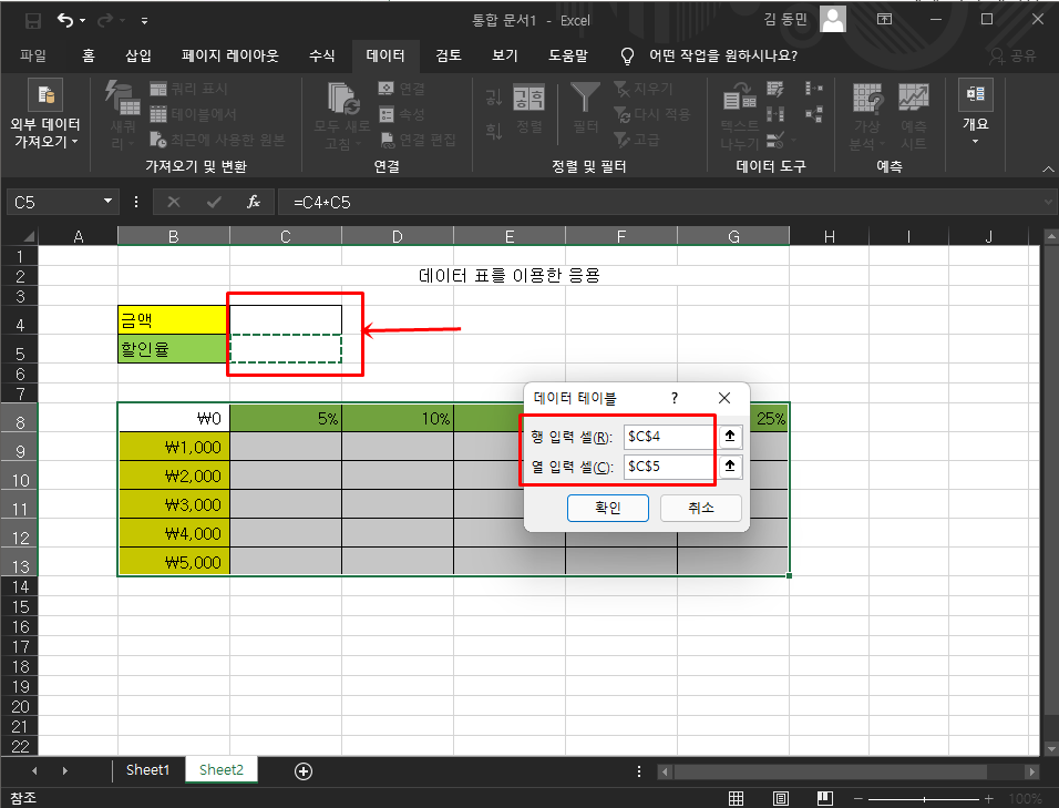 [행 입력 셀]=C4 , [열 입력 셀]=C5을 선택해주시고 [확인]을 클릭해주세요.
