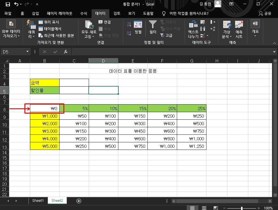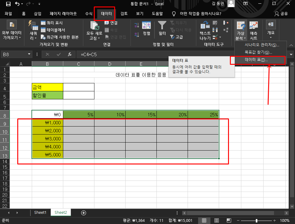 다음은 표 전체를 범위 지정하여 [데이터 탭] -> [가상분석] -> [데이터 표]를 클릭해주세요.