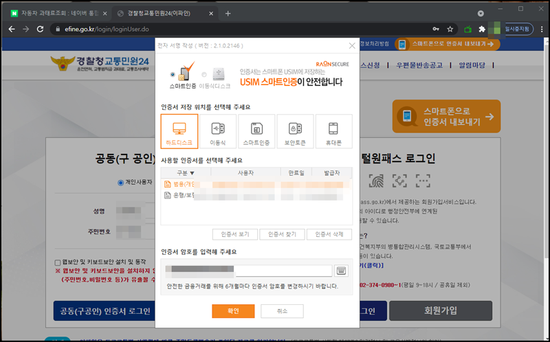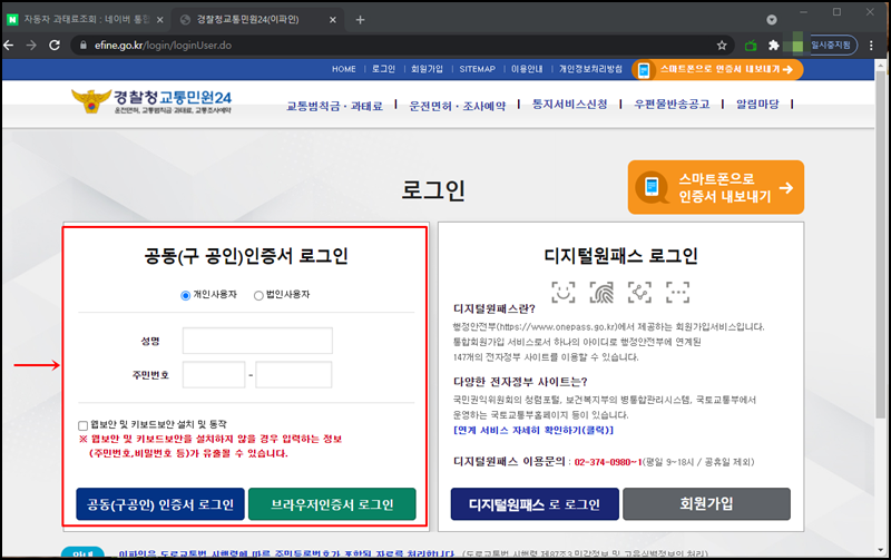 공인인증서나 브라우저 인증서를 통해 로그인이 가능해요. 저는 공인인증서 로그인으로 인증을 해볼게요.