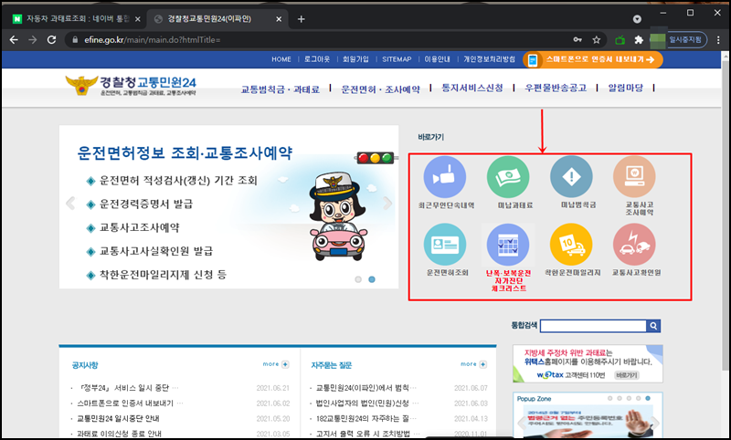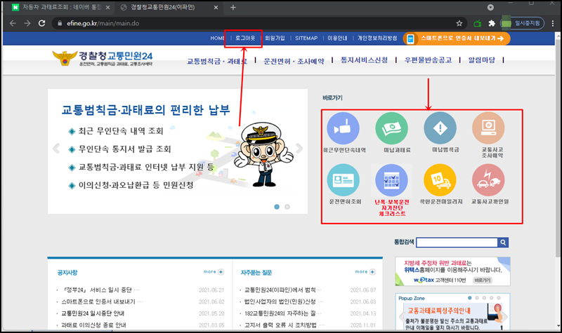 로그인하셨으면 메인페이지에서 조회하고 싶은 메뉴를 클릭해주세요. 저는 미납범침금을 조회해볼게요.