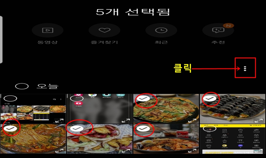 콜라주 만들 사진을 위 사진처럼 선택 후 상단의 점 3개 표시 메뉴를 클릭해주세요.