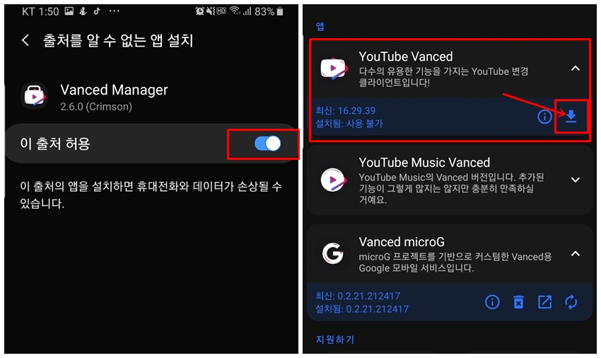"이 출처 허용"을 활성화해주시고 설치를 진행해주세요. Vanced microG가 설치가 끝나시면 다음은 youTube Vanced를 클릭하여 설치를 진행해주세요.