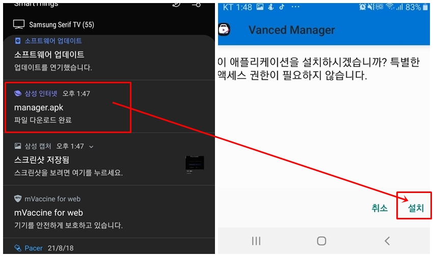 상단 스크롤바를 내려보면 금방 다운로드가 되셨을 거예요. Manager.apk 파일을 선택해서 [설치]를 진행해주세요.