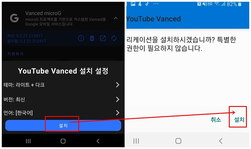 우선 첫 번째로 [Vanced microG]를 클릭하여 설치 버튼을 클릭하여 설치를 진행해주세요. 만약 사진 우측과 같이 나오신다면 [설정] 버튼을 클릭해주세요.