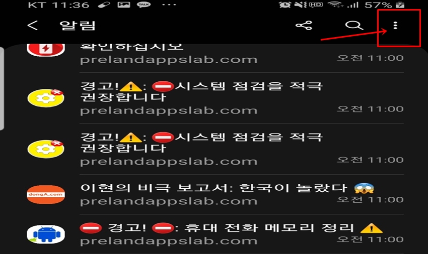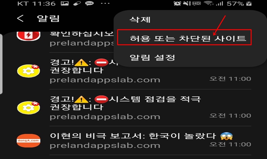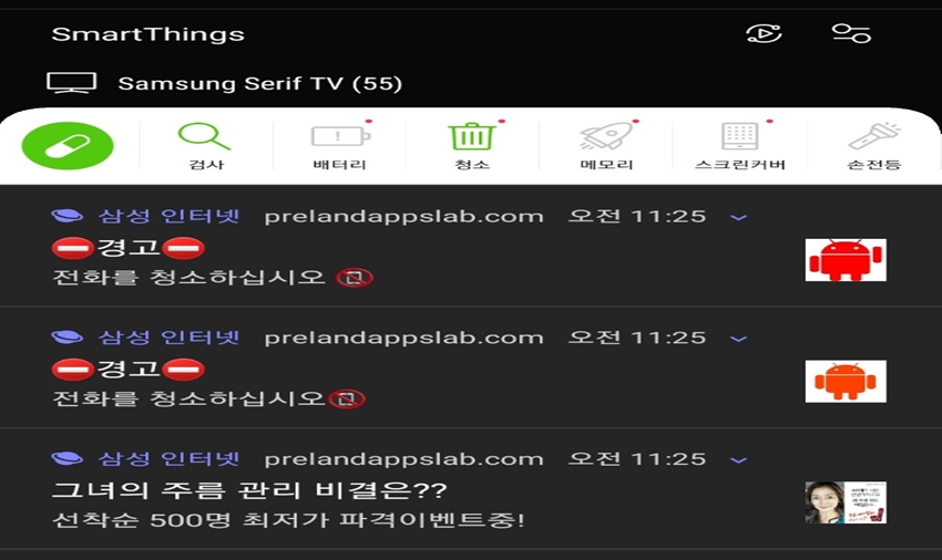 우선 증상을 알아봐야겠죠? 저의 경우 "삼성 인터넷" 경고창으로 prelandappslab.com에서 광고 등 경고 창을 계속 보내오네요. 모르고보면 핸드폰에 큰 문제라고 생긴 줄 알겠어요.