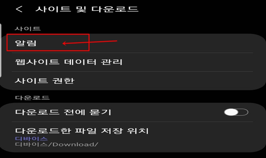 사이트 및 다운로드에서 [알림]을 클릭해서 들어가 주세요.