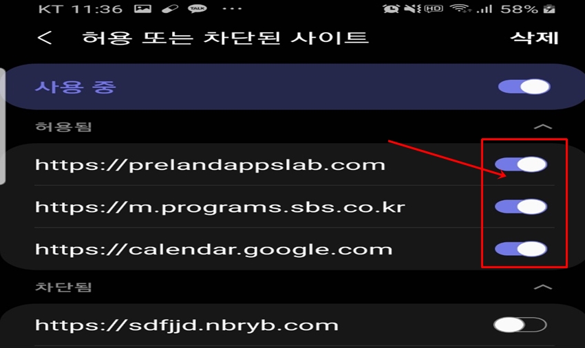 허용된 사이트를 보시면 광고 메시지를 보내왔던 https://prelandappslab.co 이 허용되어 있음을 확인할 수 있어요. 해당 부분을 비활성화하시면 지금까지 인터넷 브라우저 광고 메시지 때문에 고통받을 일은 없으실 거예요^^. 참 쉽죠?