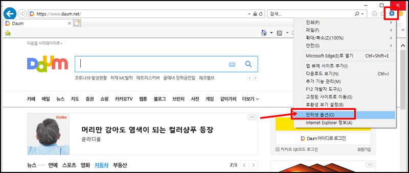 익스플로러를 실행 후 오른쪽 상단 톱니바퀴[설정]를 클릭 후 [인터넷 옵션]으로 들어가 주세요.