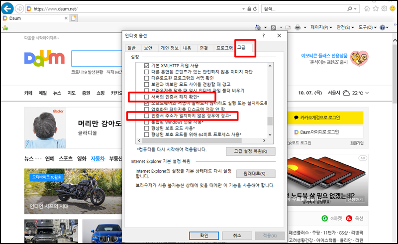 고급 탭으로 이동하셔서 [보안] 설정 부분에 위 사진과 같이 "서버의 인증서 해지 확인" , "인증서 주소가 일치하지 않은 경우 경고" 부분을 체크를 해지 후 적용해주세요.