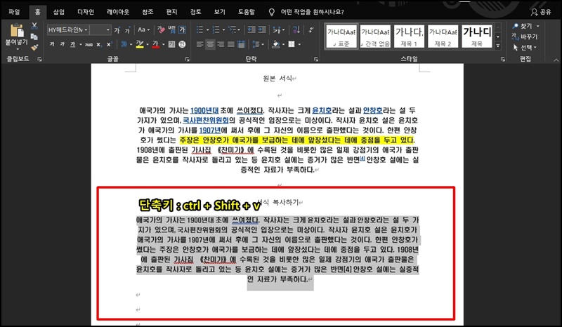 다시 적용할 텍스트의 드래그 범위지정 후 Ctrl + Shift + V를 눌러주시면 간단하게 복사한 서식을 적용이 돼요. 참 쉽죠?^^