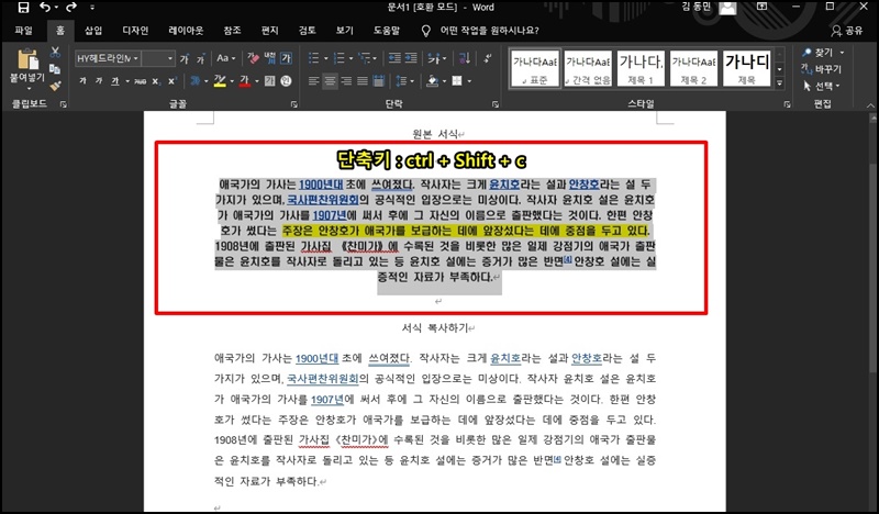 워드에서 서식 복사하는 단축키는 복사할 텍스트를 범위 지정하신 후 Ctrl + Shift + C를 눌러주세요.