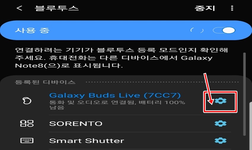 갤럭시 버즈 라이브 디바이스 오른쪽에 [톱니바퀴] 설정을 클릭해주세요.