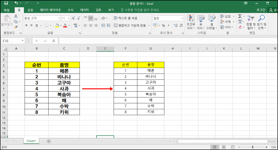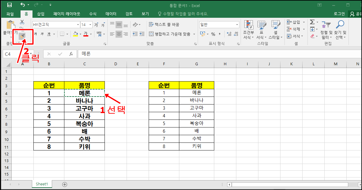 우선 간단한 예로 위와 같은 데이터가 있다고 가정해볼게요. 왼쪽의 서식과 동일하게 오른쪽도 적용해야하는데 만약 서식 복사하여 적용하는 방법을 모른다고 하나씩 수작업을 해야 하는 수고가 들 수가 있어요. 간단한 데이터라면 상관없겠지만 데이터량이 많다면 정말 막일 작업이겠죠?^^