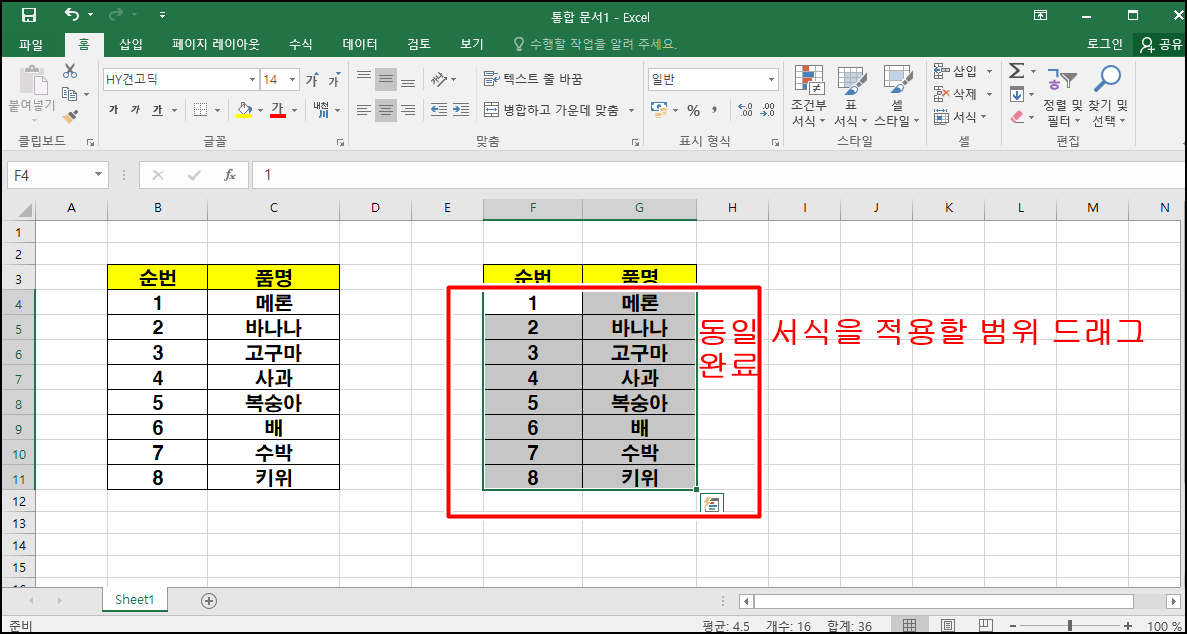 이제 적용하고 싶은 셀에 마우스로 범위 드래그하시면 위 사진과 같이 동일한 서식으로 저장이 완료가 돼요^^. 참 쉽죠?