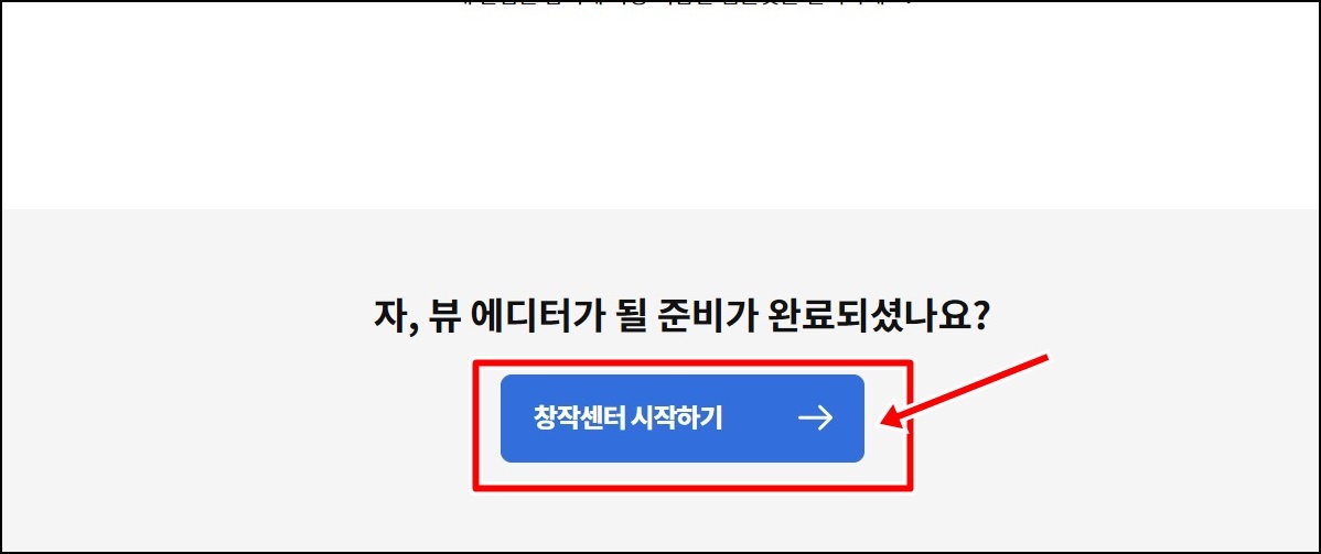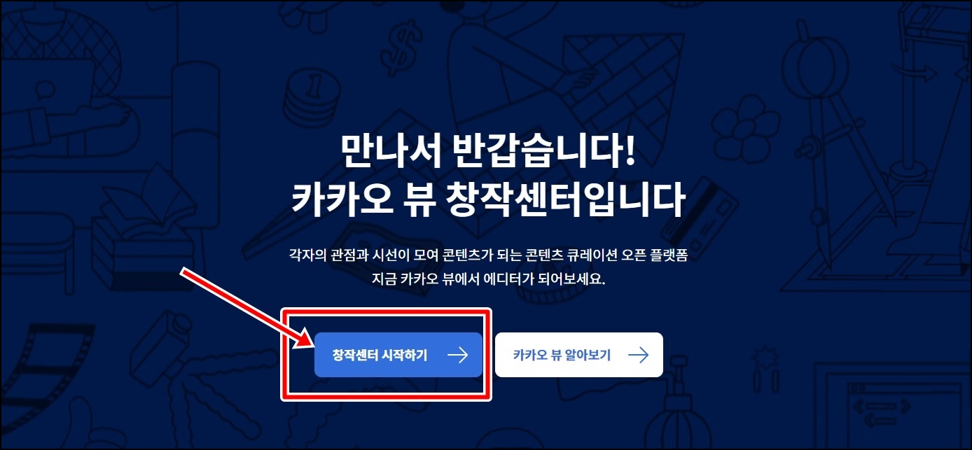 카카오 뷰 창작센터 홈페이지 접속 후 사진과 같이 [창작센터 시작하기]를 클릭해주세요.
