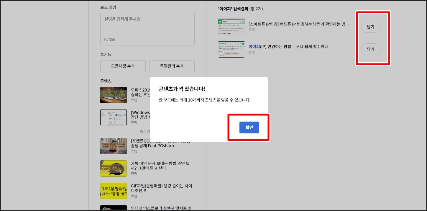 모드 설명 등을 입력 후 티스토리 포스팅 글을 담기 버튼을 클릭해서 담아주세요. 한 보드에는 최대 10개의 콘텐츠만 담을 수 있다는 점 참고해주세요.