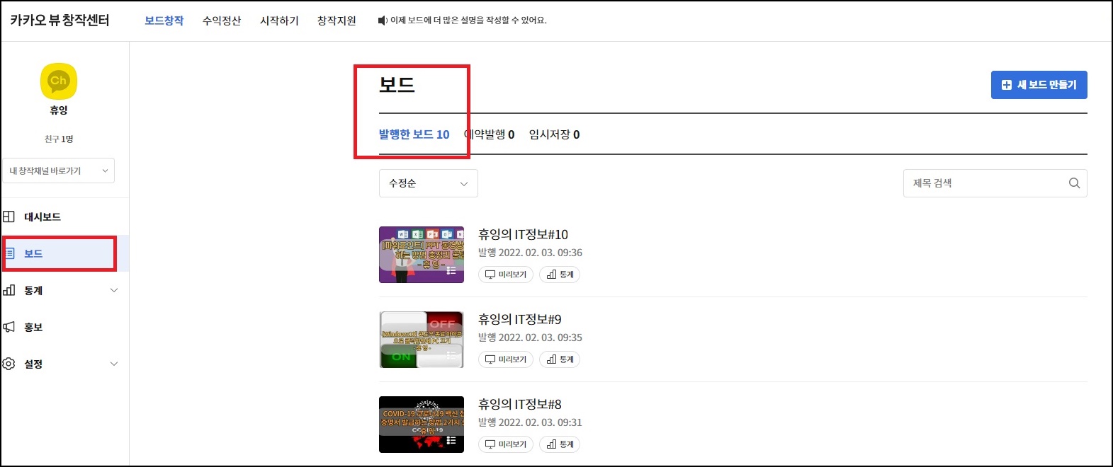 우선 저는 총 10개의 보드를 발행했어요.