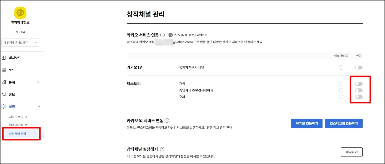 창작 채널 관리에서 여러분의 티스토리 사이트 중 연동하고 싶은 항목을 활성화해주세요.