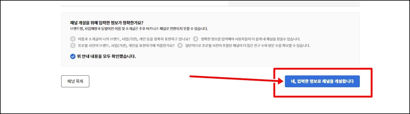 작성을 완료하셨다면 하단의 [네, 입력한 정보로 채널을 개설합니다]를 클릭해주세요.