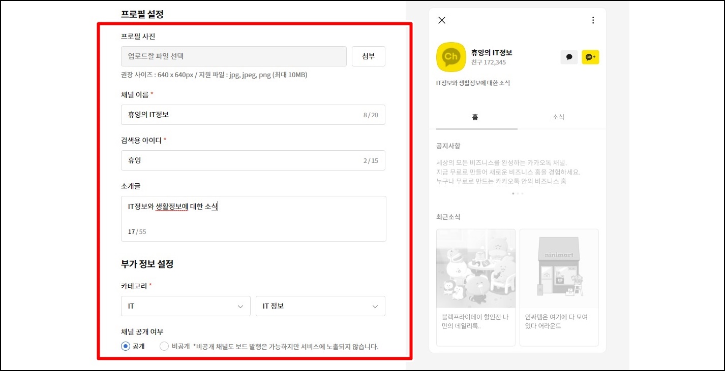 채널 만들기를 클릭하시면 위 사진과 같이 확인하실 수 있는데, 프로필 사진과 채널 이름, 검색용 아이디 소개글 등을 입력하시면 실시간으로 오른쪽에 다른 사람들에게 내 채널이 어떻게 보일지 확인이 돼요.