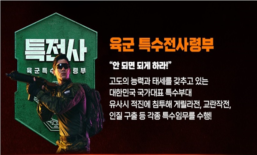대한민국 육군 소속의 특수작전부대. 명칭은 많이들 알고 계시는 "특전사"라고 부르는 곳이에요. 특수전사령부를 줄여서 특전사라고 불러요. 6.25 전쟁 당시에 특수 공작 부대인 켈로부대를 모체로 세워진 부대로 유사시 육, 해, 공의 다양한 루트를 통해 적진 깊숙이 침투하여 게릴라전, 수색, 정찰, 요인 암살 및 납치, 인질구출, 주요 시살 폭파 등 각종 비정규전을 수행하는 특수부대예요.