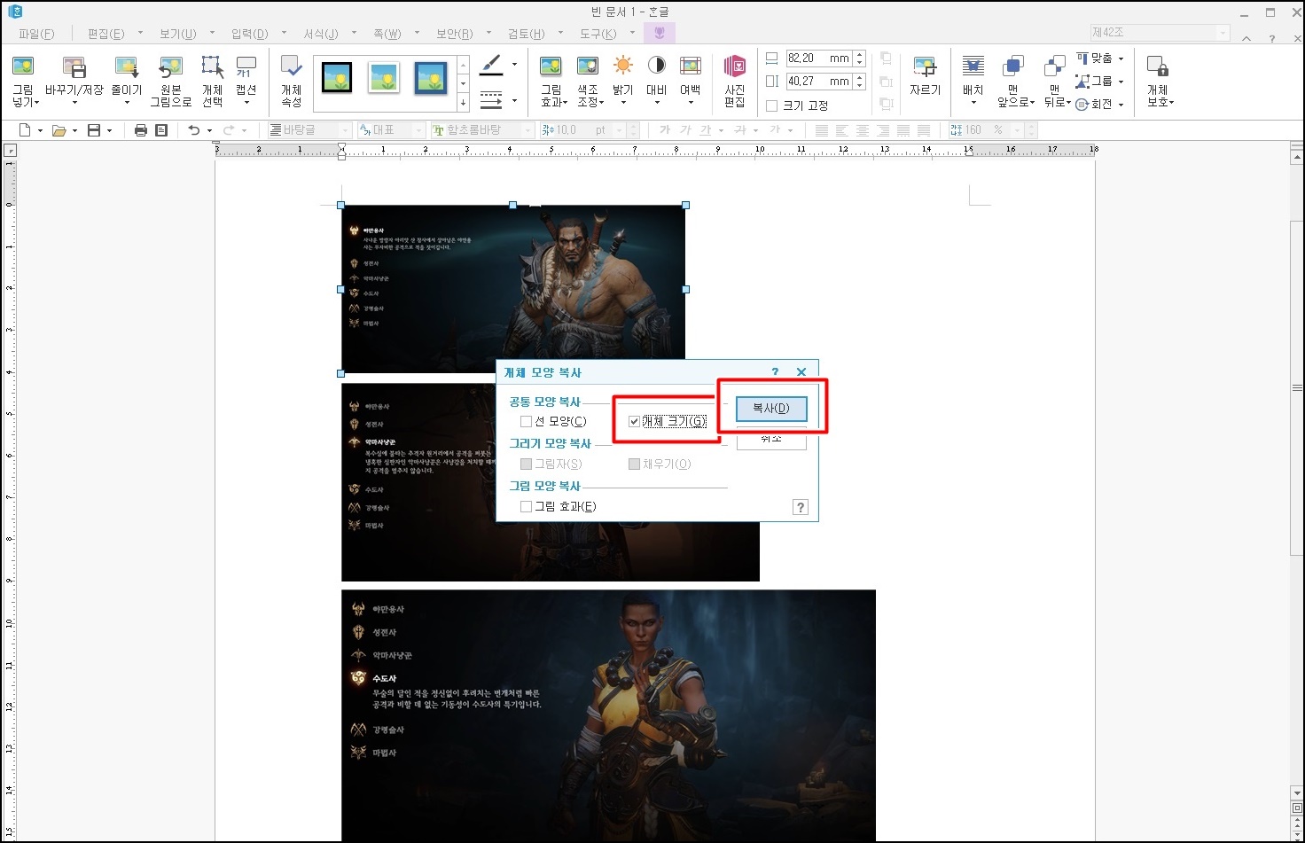 객체 모양 복사 팝업창이 나오는데 [객체 크기]항목에 체크를 하시고 [복사] 버튼을 클릭해주세요.