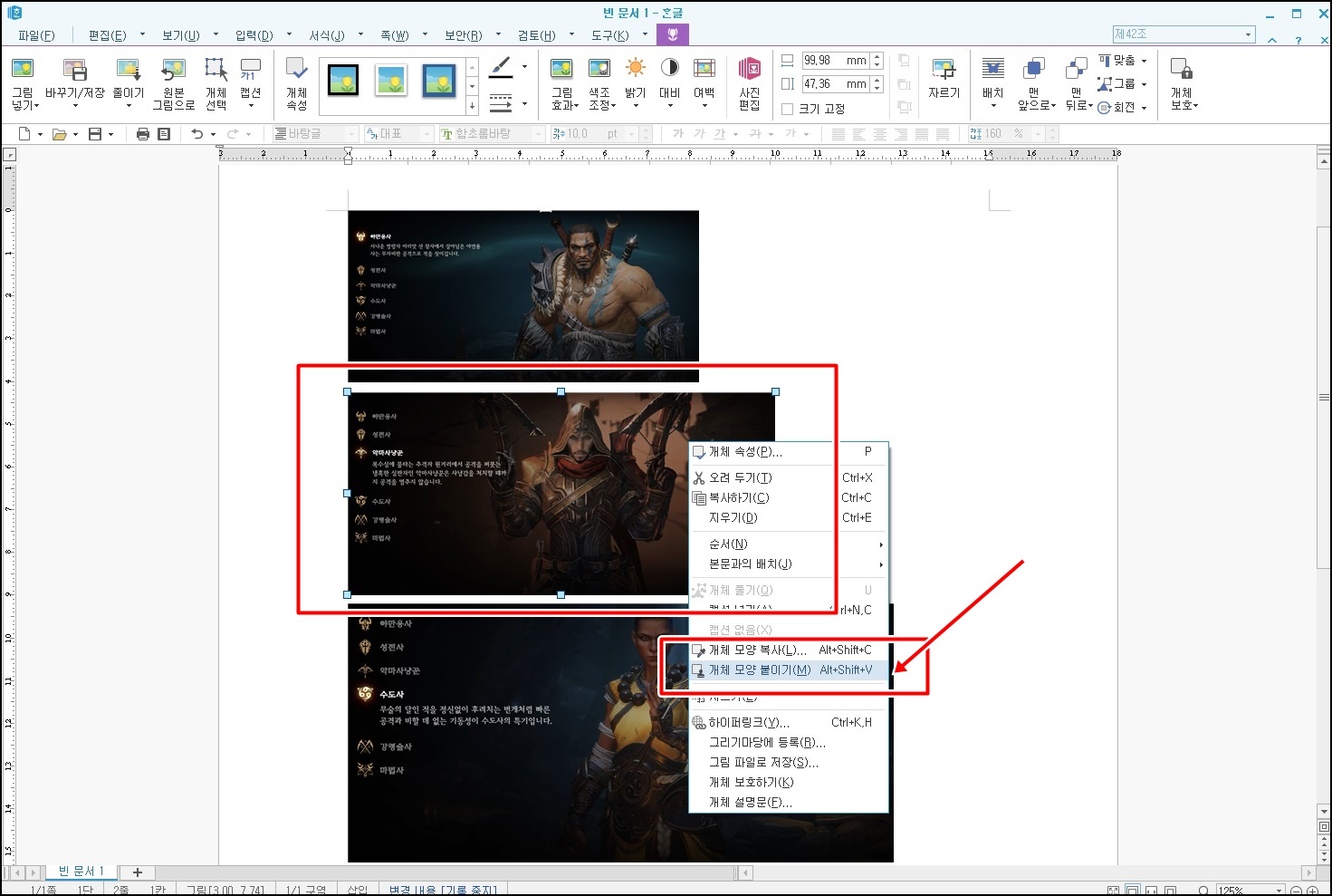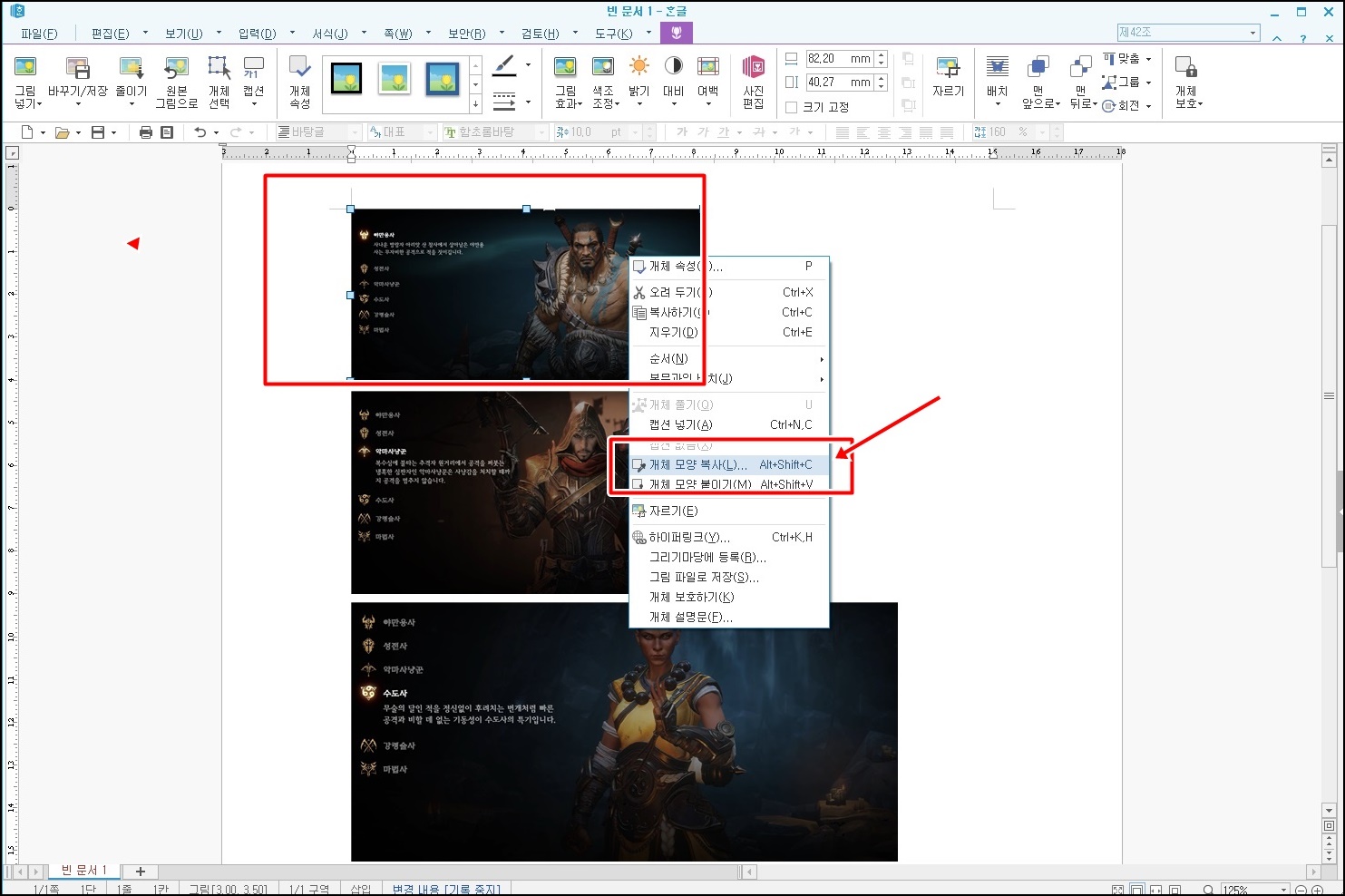 우선 표준이 될 사진을 클릭, 마우스 오른쪽 클릭 후 [객체 모양 복사]를 클릭 혹은 Alt+Shift+c 단축키를 클릭해주세요.