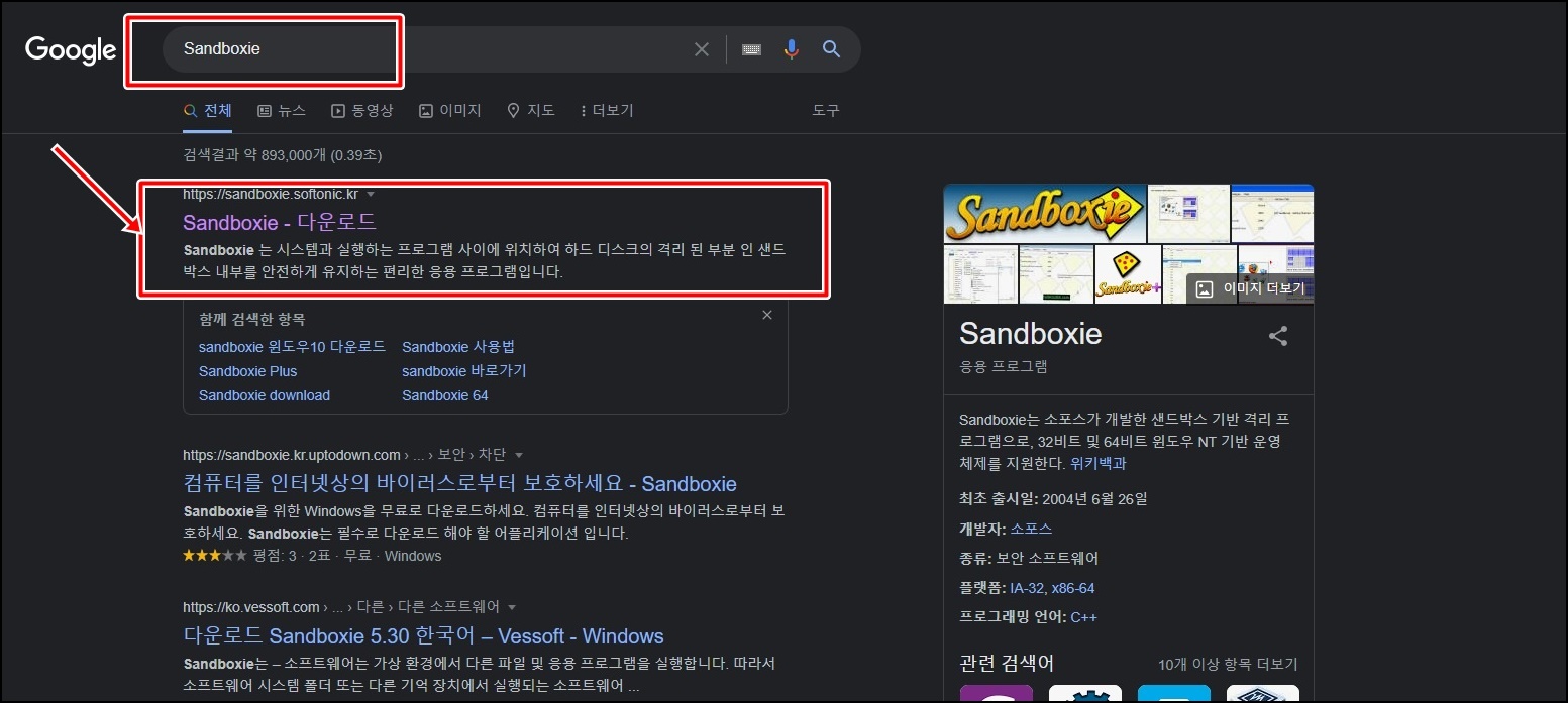 설치를 하기 위해 구글 검색창에 "sandboxie"라고 검색하시면 위 사진과 같이 "Sandboxie 다운로드"를 확인하실 수 있어요. 클릭해서 들어가 주세요.