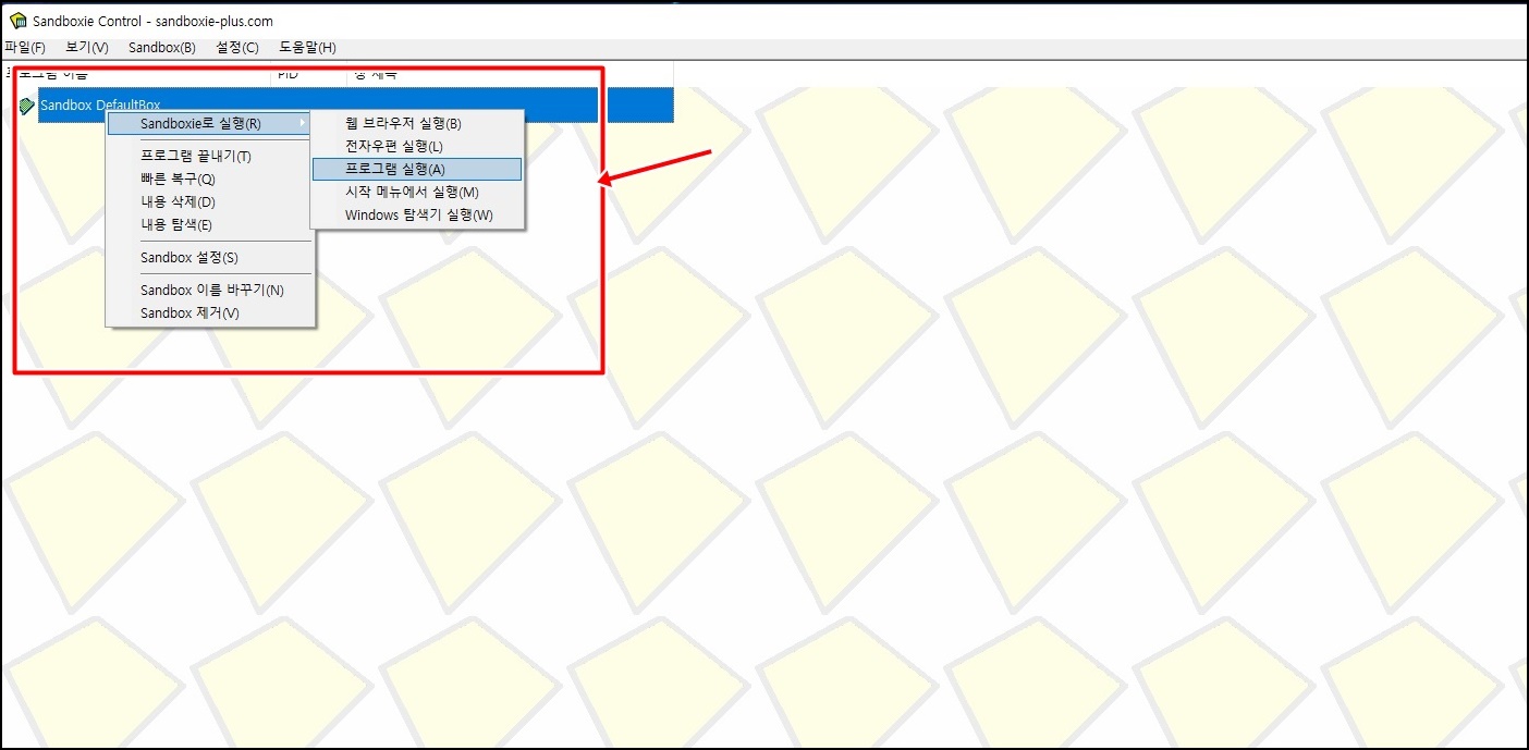 설치가 끝나면 위 사진과 같이 "Sandboxie Control" 프로그램이 실행이 되실 거예요. 이제 또 하나의 카카오톡을 실행하기 위해선 "Sandbox DefaultBox"를 마우스 우클릭하여 "Sandboxie로 실행" -> "프로그램 실행"을 클릭해주세요.