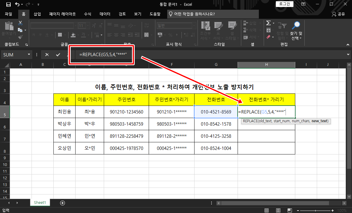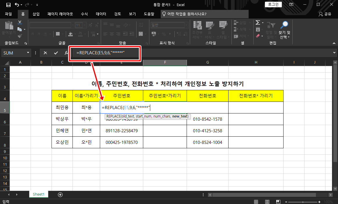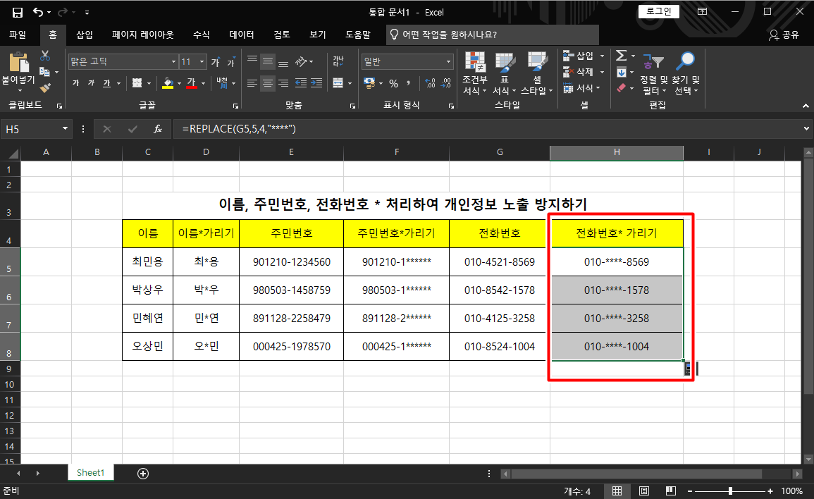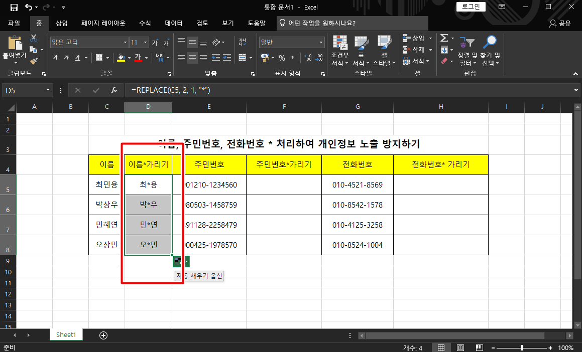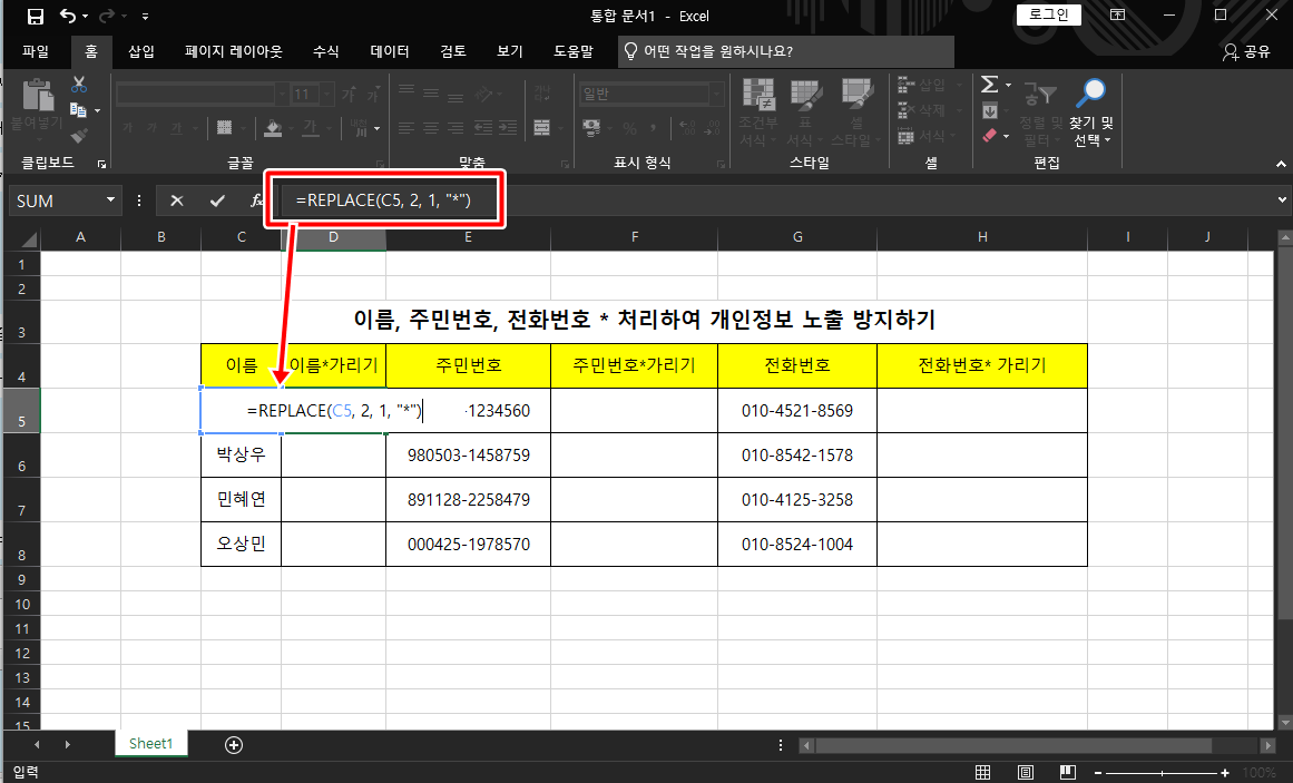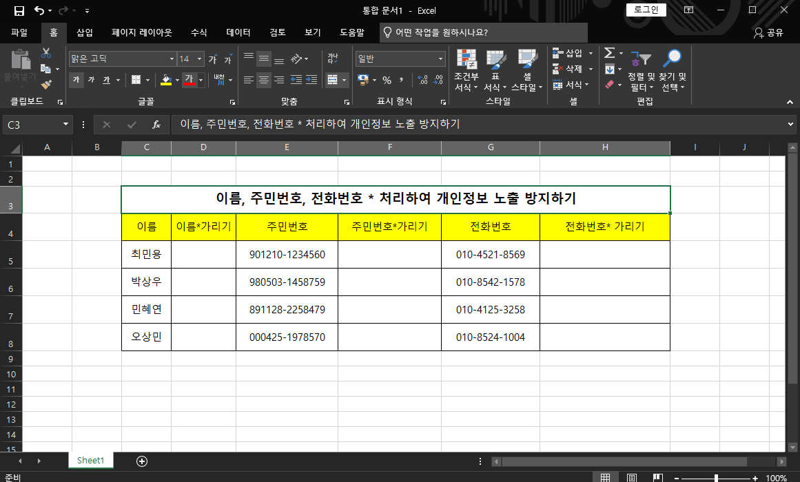 [엑셀]이름, 주민번호, 연락처 개인정보보호를 위해 *표시로 가려보자